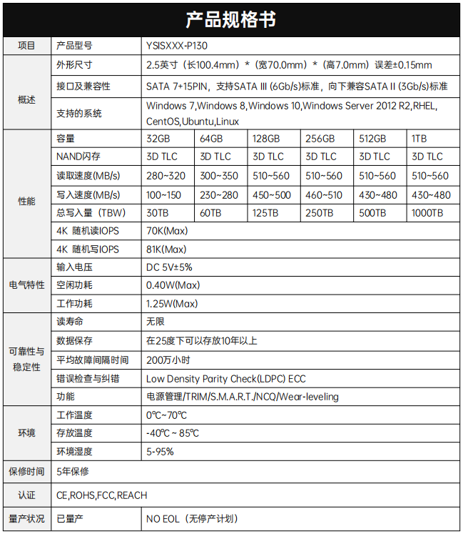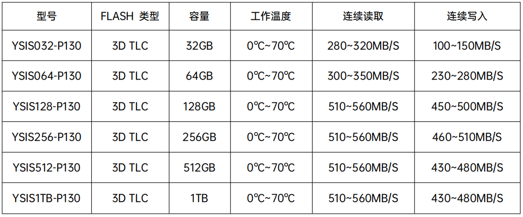 YSISXXX-P130 使用3D TLC NAND Flash,為了保證數(shù)據(jù)的完整性,采用了動(dòng)態(tài)壞塊管理、動(dòng)靜態(tài)磨損平衡、LDPC校驗(yàn)糾錯(cuò)等先進(jìn)的技術(shù)。此外,YSISXXX-P130的性能遠(yuǎn)超于傳統(tǒng)硬盤。