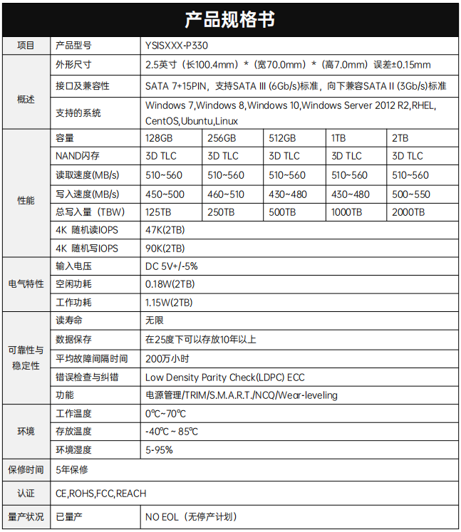 YSISXXX-P330產(chǎn)品采用2通道SSD控制器和3D NAND Flash,接口尺寸為2.5寸 SATA。YSISXXX-P330符合串口ATA I/II/III標準并支持SATA 3.2協(xié)議。