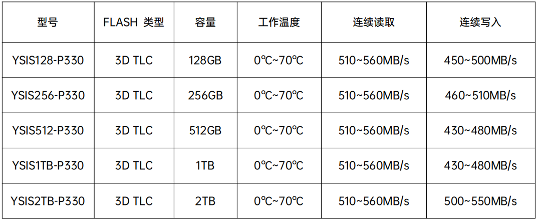 YSISXXX-P330 使用3D TLC NAND Flash。為了保證數(shù)據(jù)的完整性,采用了動態(tài)壞塊管理、動靜態(tài)磨損平衡、LDPC校驗糾錯等先進的技術(shù)。此外,YSISXXX-P330的性能遠超于傳統(tǒng)硬盤。