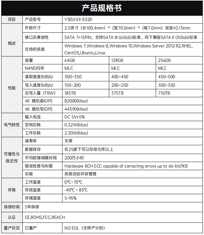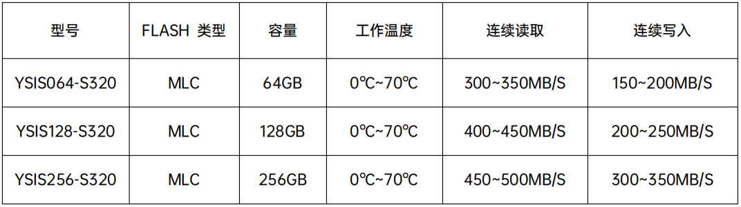 YSISXXX-S320產(chǎn)品采用4通道SSD控制器和2D/3D MLC NAND Flash,接口尺寸 為2.5寸SATA。