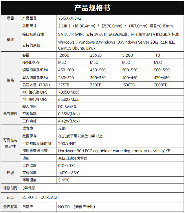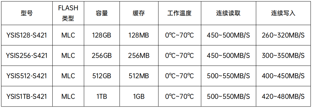 YSISXXX-S421產(chǎn)品采用4通道SSD控制器和2D/3D MLC NAND Flash,接口尺寸 為2.5寸SATA。