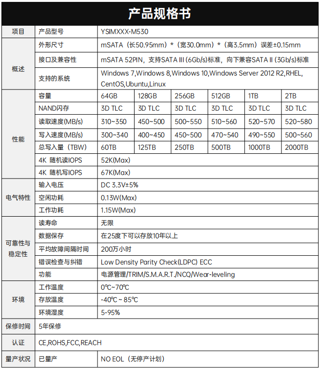 YSIMXXX-M530產(chǎn)品采用2通道SSD控制器和3D NAND Flash,接口尺寸為 mSATA,小巧的尺寸讓該產(chǎn)品可以集成在平臺(tái)內(nèi)。