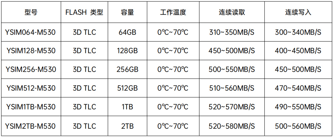 YSIMXXX-M530符合串口ATA I/II/III 標(biāo)準(zhǔn)并支持SATA 3.2協(xié)議。YSIMXXX-M530使用3D TLC NAND Flash。因此,為了保證數(shù)據(jù)的完整性,采用了動(dòng)態(tài)壞塊管理、動(dòng)靜態(tài)磨損平衡、LDPC校驗(yàn)糾錯(cuò)等先進(jìn)的技術(shù)。 此外,YSIMXXX-M530的性能遠(yuǎn)超于傳統(tǒng)硬盤。