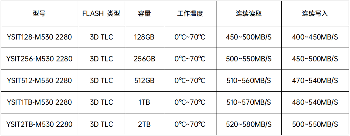 YSITXXX-M530 2280產(chǎn)品采用2通道SSD控制器和3D NAND Flash,接口尺寸為 M.2(B&M Key)2280,小巧的尺寸讓該產(chǎn)品可以集成在平臺內(nèi)。YSITXXX-M530 2280 符合串口ATA I/II/III標準并支持SATA 3.2協(xié)議。