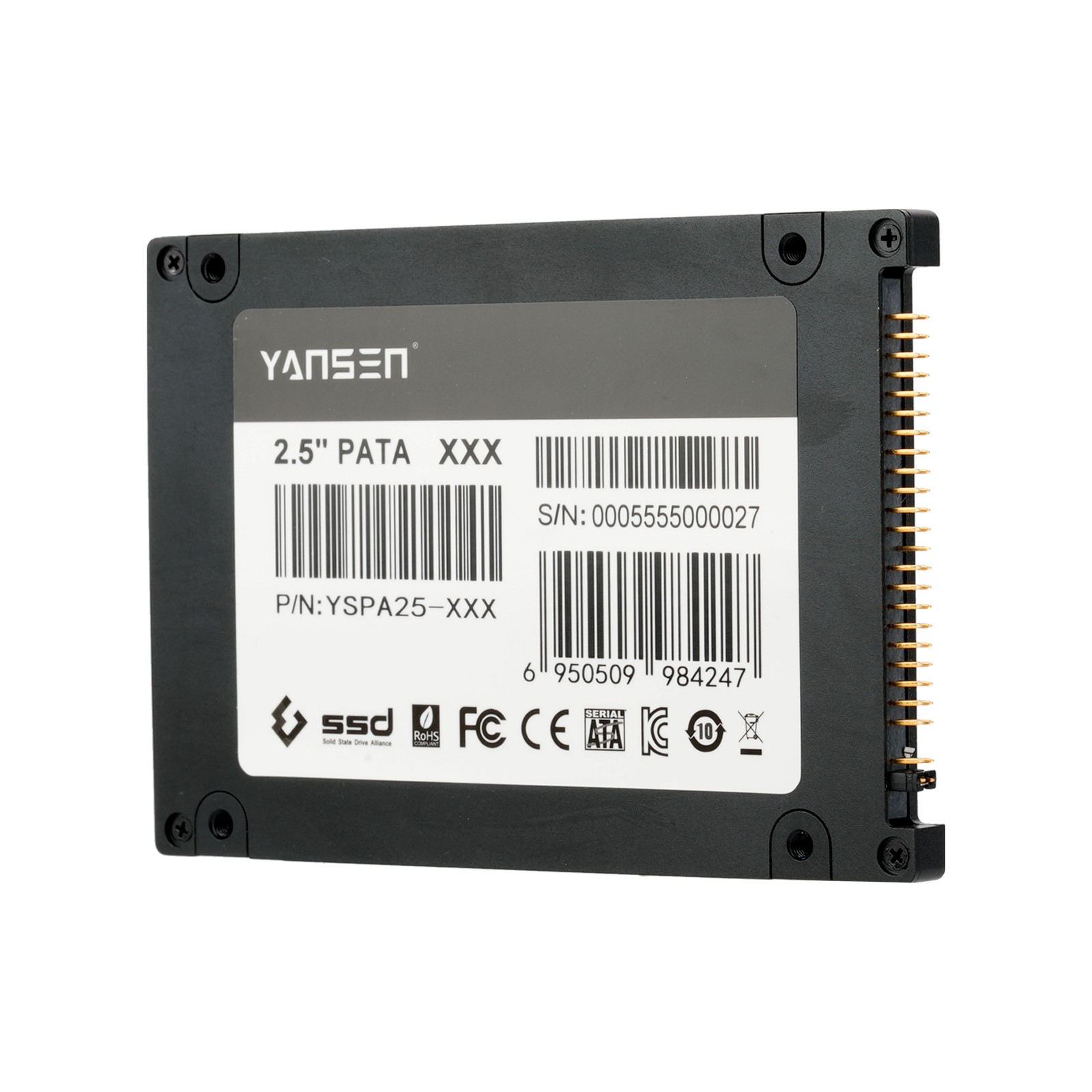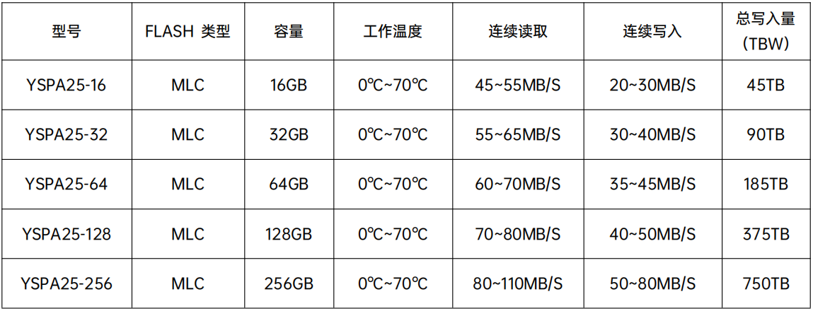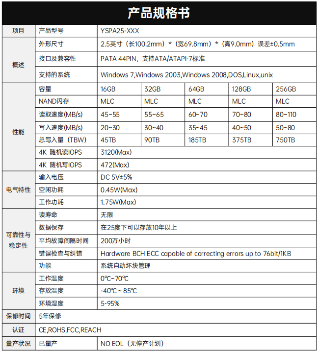 YSPA25-XXX是一款高性能高可靠性的存儲設(shè)備,純粹由半導(dǎo)體器件和非易失性 NAND Flash芯片構(gòu)成,基于NAND Flash技術(shù),解決機(jī)械硬盤傳輸速度不高的瓶頸,內(nèi)部沒有機(jī)械部件,解決抗震防跌落的問題。它擁有和機(jī)械硬盤完全相同的連接端口,因此可以 完全替換機(jī)械硬盤。