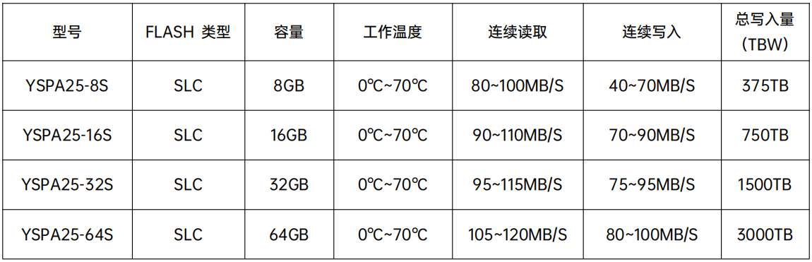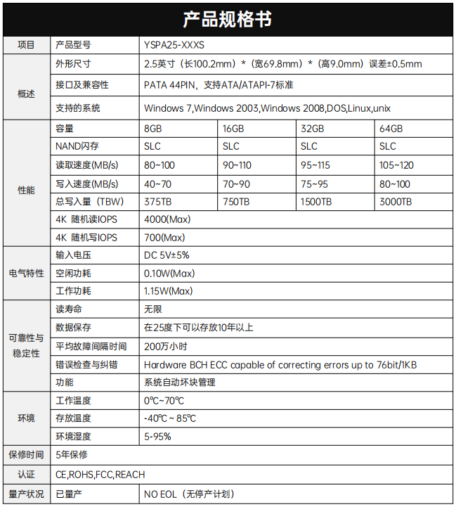 YSPA25-XXXS是一款高性能高可靠性的存儲(chǔ)設(shè)備,純粹由半導(dǎo)體器件和非易失性 NAND Flash芯片構(gòu)成,基于NAND Flash技術(shù),解決機(jī)械硬盤傳輸速度不高的瓶頸,內(nèi)部沒有機(jī)械部件,解決抗震防跌落的問題。它擁有和機(jī)械硬盤完全相同的連接端口,因此可以 完全替換機(jī)械硬盤。