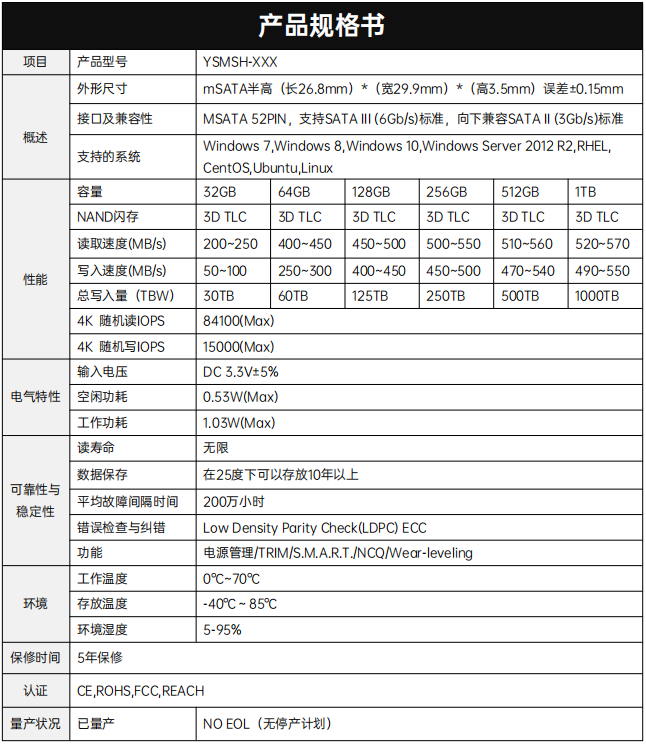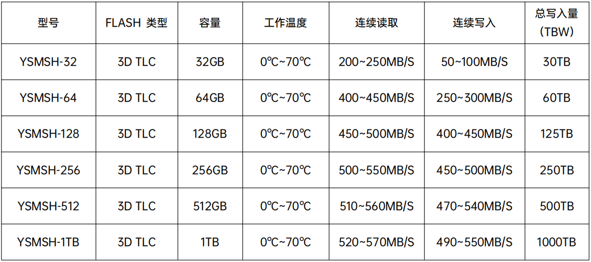 YSMSH-XXX具有高性能,低功耗等特點(diǎn),是存儲(chǔ)設(shè)備和計(jì)算機(jī)存儲(chǔ)應(yīng)用的完美解決 方案,先進(jìn)的閃存管理算法保證更高的性能和數(shù)據(jù)完整性。