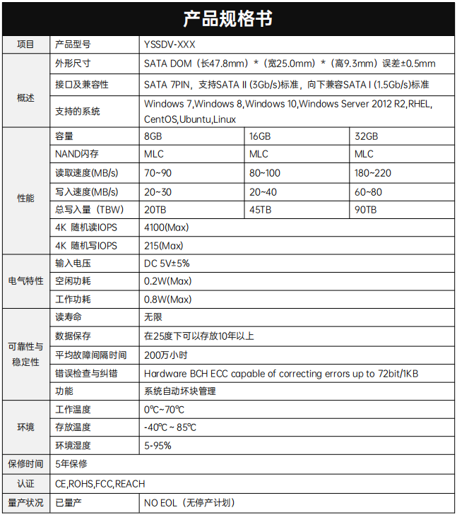 YSSDV-XXX具有高性能,低功耗等特點(diǎn),是存儲(chǔ)設(shè)備和計(jì)算機(jī)存儲(chǔ)應(yīng)用的完美解決 方案,先進(jìn)的閃存管理算法保證更高的性能和數(shù)據(jù)完整性。
