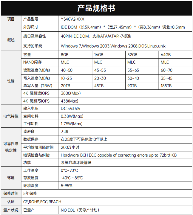 YS40V2-XXX是一款高性能高可靠性的存儲設(shè)備,純粹由半導(dǎo)體器件和非易失性 NAND Flash芯片構(gòu)成,基于NAND Flash技術(shù),解決機(jī)械硬盤傳輸速度不高的瓶頸,內(nèi)部沒有機(jī)械部件,解決抗震防跌落的問題。