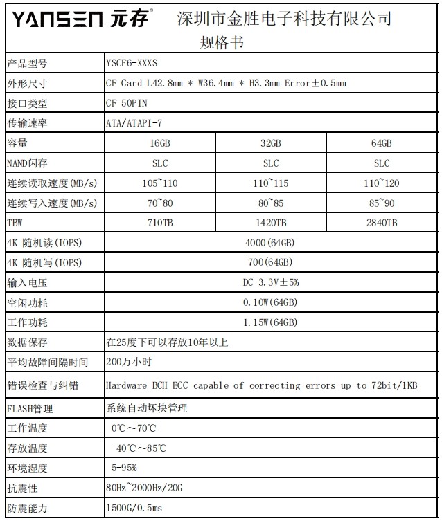 | YSCF6-16S | SLC | 16GB | 105~110 MB/S | 70~80 MB/S | 710TB |