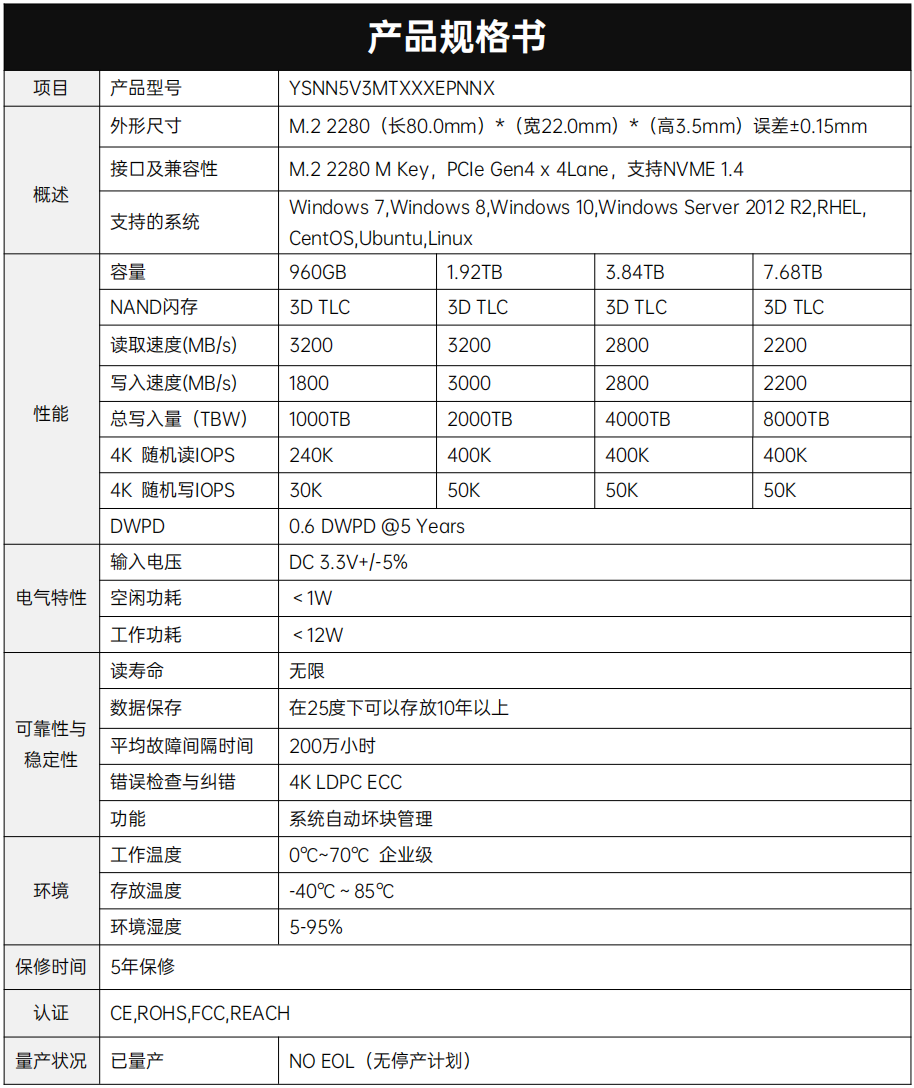YSNN5V3MTXXXEPNNX是一款基于Marvell科技88SS1321 PCle主控搭配 3DTLC NAND 閃存陣列和DDR4 緩存的M.2 2280 NVMe固態(tài)硬盤(pán),PCle Gen4x4的接口標(biāo)準(zhǔn),支持NVMe1.4協(xié)議,采用新一代LDPC 技術(shù)確保 NAND 的耐用性,大幅改善固態(tài)硬盤(pán)數(shù)據(jù)可靠性和穩(wěn)定性。